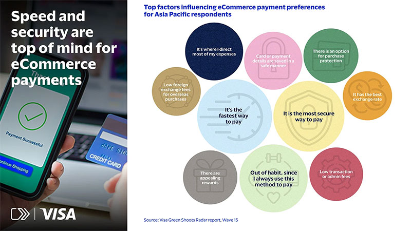 Di Asia Pasifik, kartu kredit dan debit tetap menjadi metode pembayaran paling handal untuk transaksi online, khususnya kegiatan pembelian lintas batas melalui eCommerce. Laporan Green Shoots Radar juga menunjukkan bahwa metode pembayaran ini merupakan yang paling banyak digunakan oleh konsumen ketika berbelanja daring dari penjual di luar negeri. Sebanyak 46% responden menggunakan kartu kredit atau debit untuk membayar pembelian produk dari luar negeri via platform eCommerce, dibandingkan dengan 22% yang menggunakan dompet digital.