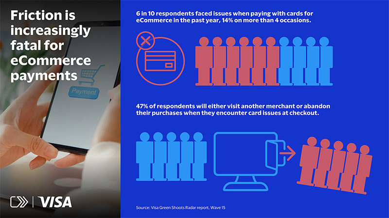 Namun, ekspektasi baru terhadap kecepatan transaksi menjadi tantangan tersendiri bagi bank penerbit kartu dan penjual eCommerce. Masih berkaca pada laporan Green Shoots Radar, 6 dari 10 responden pernah mengalami kendala dengan kartu mereka setidaknya sekali dalam setahun terakhir, dan 14% mengalaminya lebih dari empat kali. Kendala ini beragam, mulai dari kegagalan menerima Kata Sandi Satu Kali (OTP) pada saat checkout, melupakan 16 digit nomor kartu saat melakukan pemesanan melalui ponsel, dan masih banyak lagi.