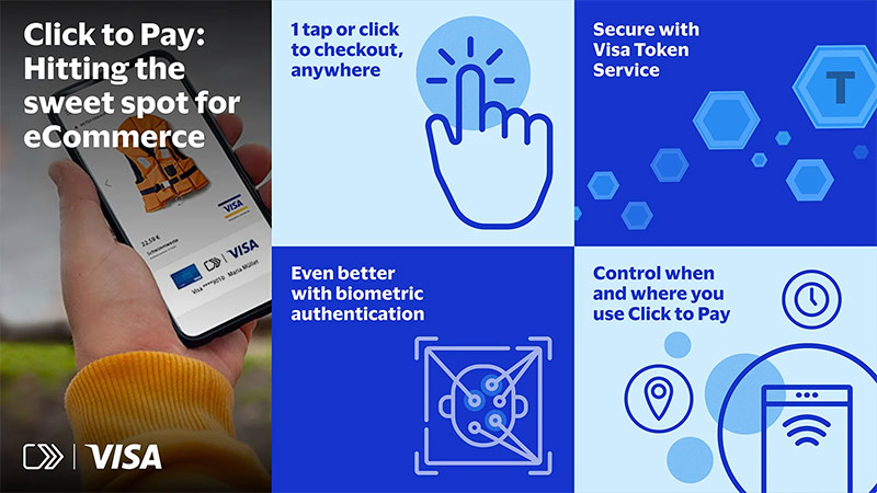 Dengan Visa Click to Pay, konsumen dapat menemukan keseimbangan yang tepat antara keamanan dan kecepatan. Layanan ini mengurangi waktu checkout secara signifikan, dari yang tadinya beberapa menit menjadi hanya beberapa detik. Saat mendaftarkan kartu, konsumen juga tidak perlu khawatir, karena detail kartu mereka disimpan dan dilindungi secara aman langsung di dalam jaringan Visa.